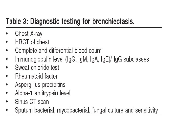 Cylindrical Bronchiectasis • The first type, cylindrical bronchiectasis, is characterized by uniform dilatation of bronchi, that extends into the lung periphery, without tapering. • Tubular bronchiectasis is simply the absence of normal bronchial tapering and is usually a manifestation of severe chronic bronchitis rather than of true bronchial wall destruction