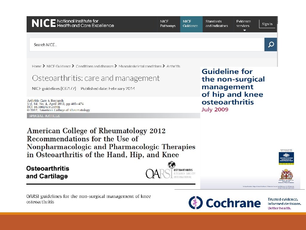 Key management areas for OA knee §Weight reduction (OA knee, females) ++ (Cochrane) §Patient education & information +? §Exercise & physical therapies §Disease-modifying therapies §Analgesia §Procedures & surgery (Review)