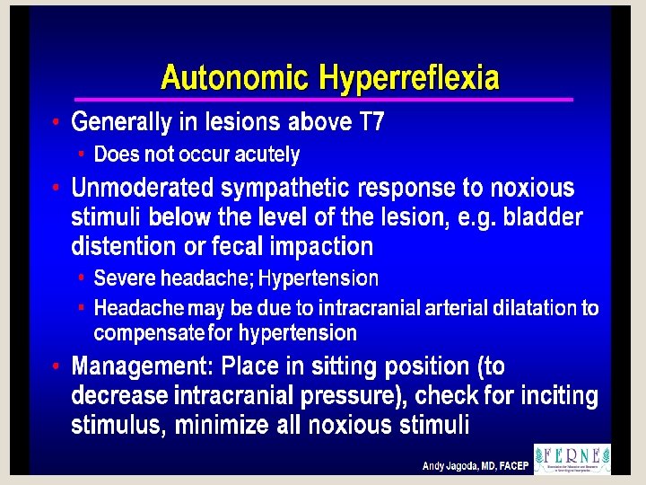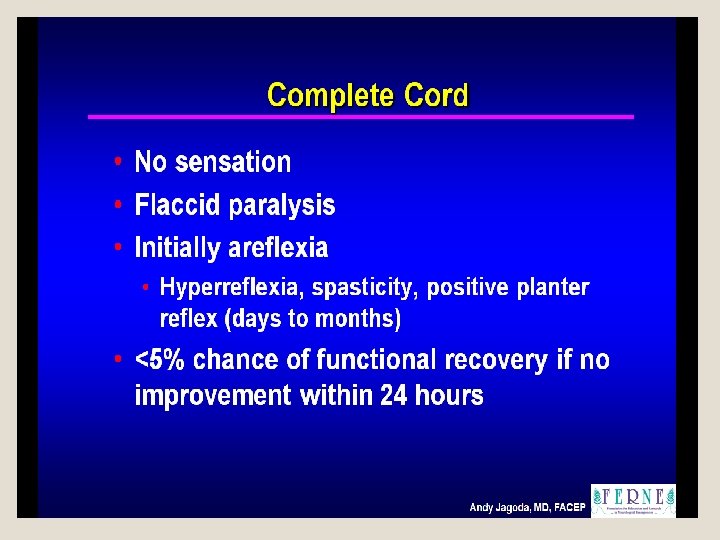 Complete spinal cord transection (Transverse myelopathy) �All acsending tracts from below the level of the lesion and all descending tract from above the level of lesion interrupted. Motor, sensory, autonomic functions below the level of lesion disturbed �Causes : ° tumour ° multiple sclerosis ° vascular disorders ° spinal epidural hematoma/ ° spinal epidural abscess ° herniated intervertebral disc ° auto immune disease