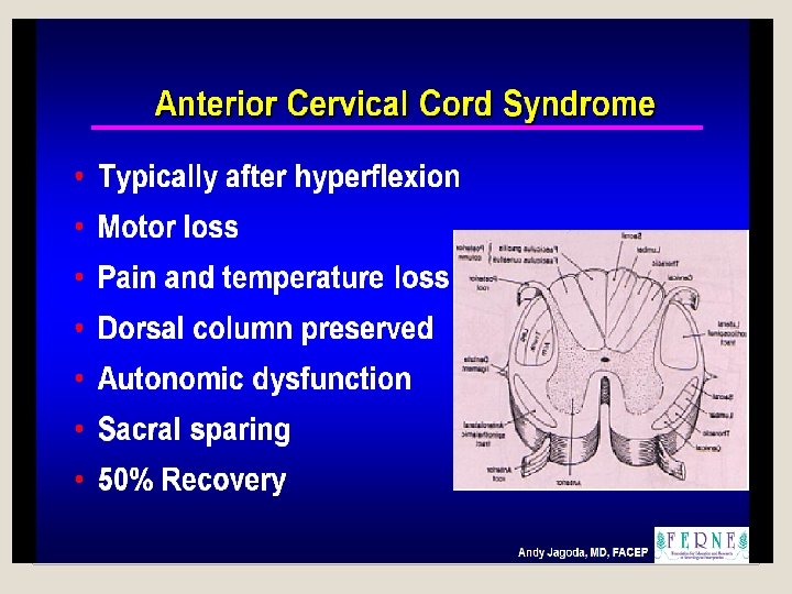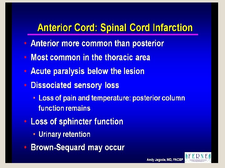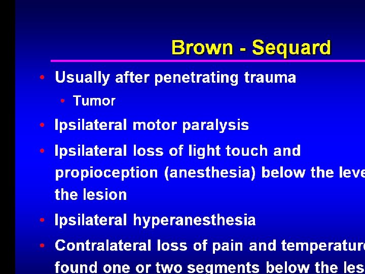 Hemisection of the spinal cord ( Brown sequard syndrome) �Loss of pain, temp C/L to the hemisectioninterruption of crossed spino thalamic tract �Loss of proprioception – interruption of ascending fibers of posterior column �Spastic weakness due to interruption of descending cortico spinal tract �Segmental LMN signs and sensory changes at the level of lesion due to damage of the roots and anterior horn cells at the level of lesion