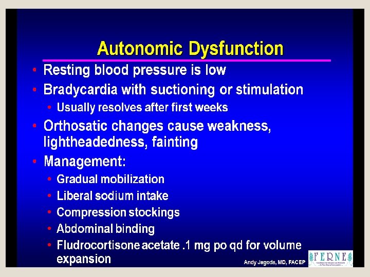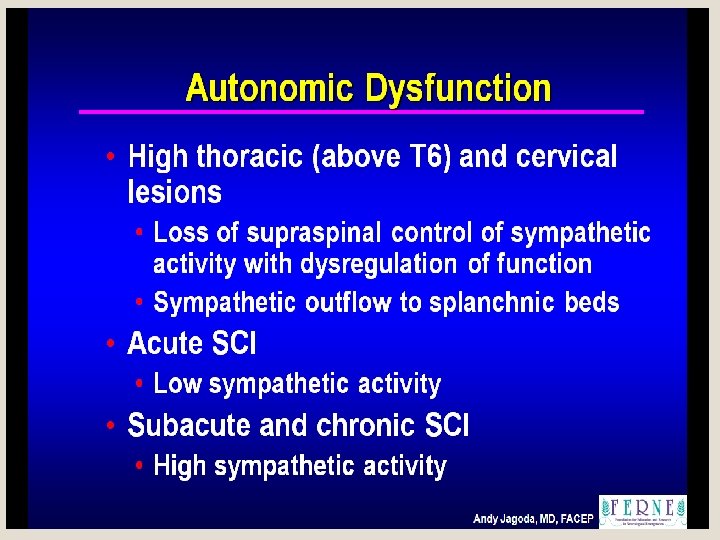 Autononomic disturbances • initially atonic, latter spastic bladder, rectal sphincter disturbances • orthostatic hypotension • trophic skin changes • anhydrosis • impaired temperature control • vasomotor instability • sexual disturbances • I/L horner syndrome