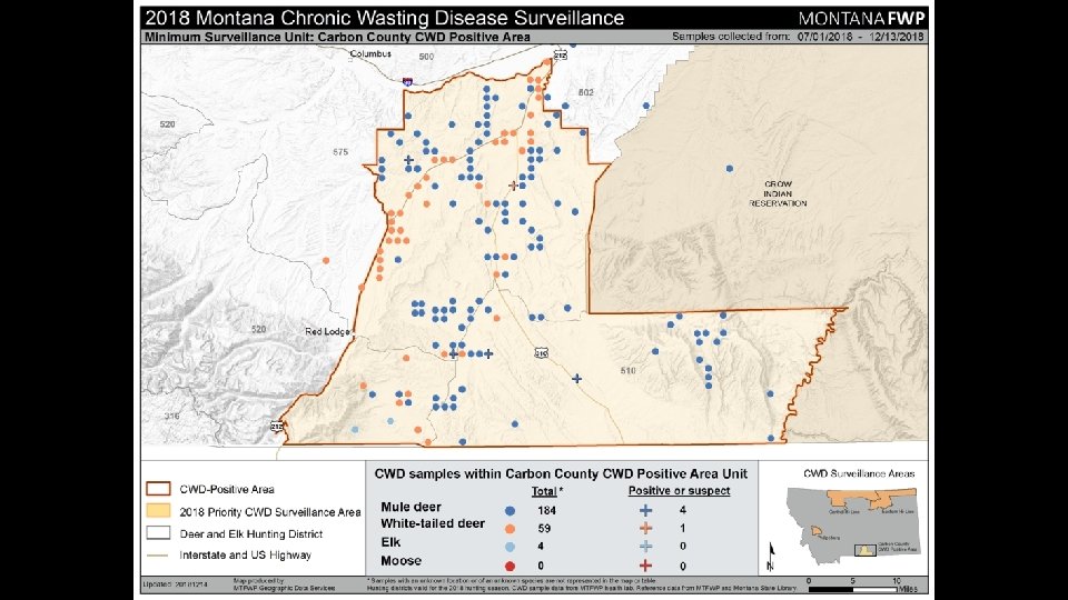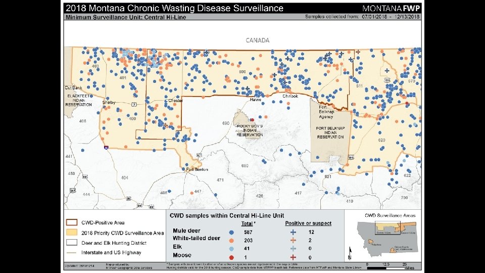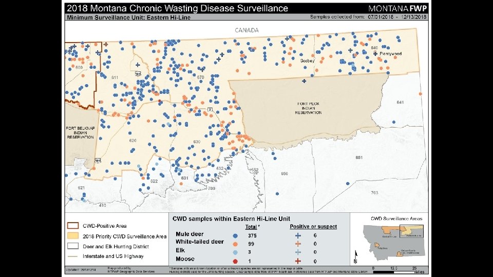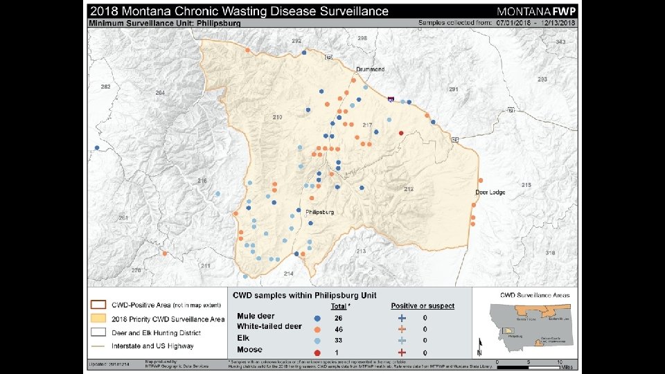 FWP CWD Planning • CWD surveillance began in 1996. • Previous CWD plans and decision notices (2005 & 2013). • Risk modelling to inform priority surveillance areas (2014). • Internal CWD Action Team (2016). • CWD Citizen’s Advisory Panel (2017). • Renewed surveillance efforts (2017). • Updated surveillance and management plans (2017 -2018).