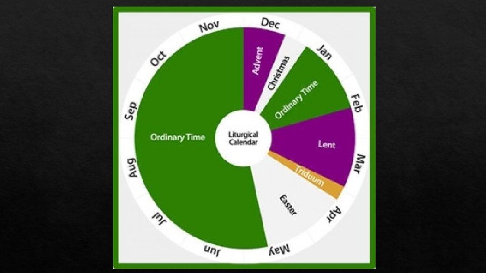 Seasons Advent Christmas Holy Thursday, Good Friday, and Holy Saturday Easter Six weeks pf penance before Easter (starts with Ash Wednesday and ends on Holy Thursday) Triduum Nativity of Jesus Christ Lent 4 Weeks before Christmas 50 days of celebration Ordinary Time Divided into 2 sections (4 -8 weeks after Christmas and another about 6 months after Easter