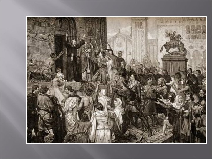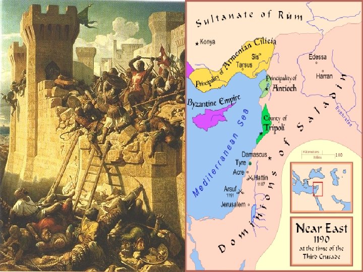 Causes 1093 Byzantine Empire Alexius I asked Pope Urban III for help fighting the Seljuk Turks Urban agrees and calls for help at the Council of Clermont in 1095 Rallied warriors for the liberation of Jerusalem and Holy Land from the Infidels, or unbelievers, the Muslims “all who die shall have immediate remission of sins” Within a year knights were on their way Motives: Knights wanted to win wealth and land Were promised remission of their sins adventure Crusaders wanted to escape trouble at home Pope Urban wanted to increase power and help heal schism Kings and Princes used crusades to legitimize their rule by presenting themselves as a truly “Christian” state