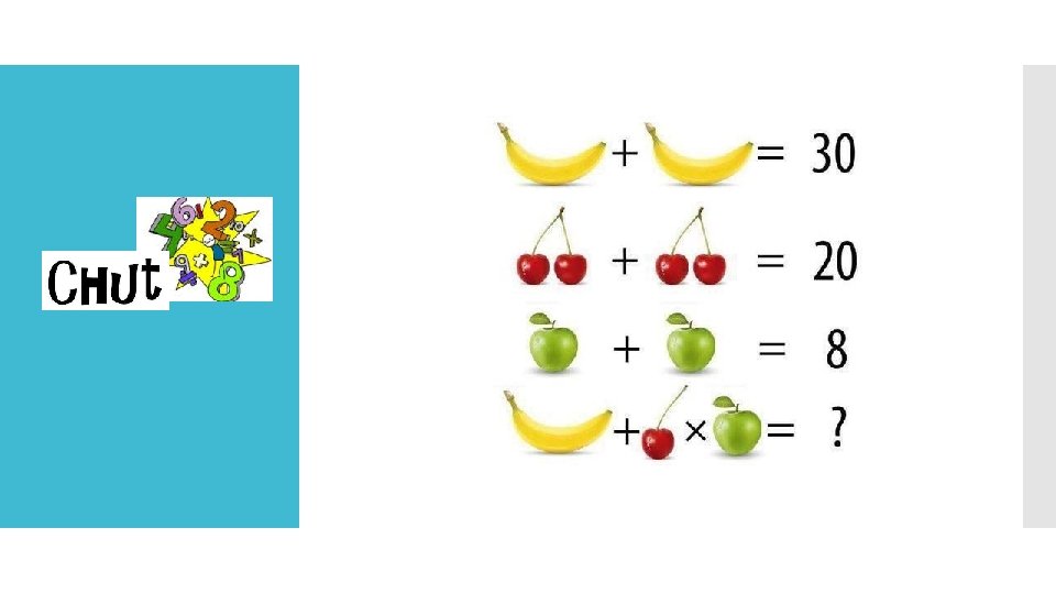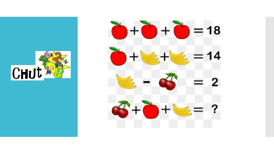 1 pomme vaut 6 1 régime de 4 bananes vaut 4 donc 1 banane vaut 1 2 cerises valent 2 Il n’y a que 3 bananes Le calcul à effectuer : 2 + 6 + 3 x 1 = 11 2 cerises + 1 pomme + 3 bananes