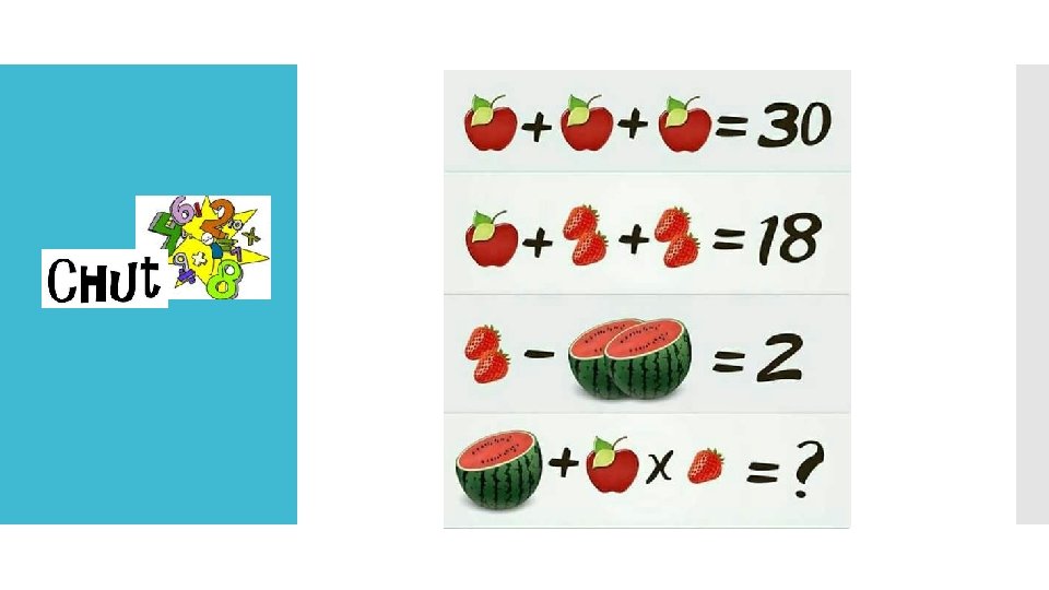 1 pomme vaut 10 2 fraises valent 4 donc 1 fraise vaut 2 1 pastèque entière vaut 2 donc 1 demi pastèque vaut 1 1 demi pastèque et 1 seule fraise Calcul à effectuer : 1 + 10 x 2 = 1 + 20 = 21