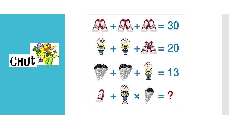 1 paire de basket vaut 10 1 bonhomme vaut 5 s’il est sans basket 2 cornets valent 4 1 seule basket, le bonhomme porte une paire de basket mais aussi 2 cornets Calcul à effectuer : 5 + (5+10+4) x 2 = 5 + 19 x 2 = 5 + 38 = 43