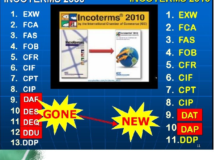 2. Lịch sử hình thành và phát triển của Incoterms • Năm 1936: Bộ Incoterms đầu tiên • Năm 1953: giải thích về 9 điều kiện • Năm 1967: sửa đổi nội dung của Incoterms 1953 • Năm 1976: Thêm phụ lục của Incoterms 1953 • Năm 1980: Giải thích 14 điều kiện • Năm 1990: Giải thích 13 điều kiện • Năm 2000: Giải thích 13 điều kiện trong ĐK TMĐT • Năm 2010: Giảm xuống còn 11 ĐK