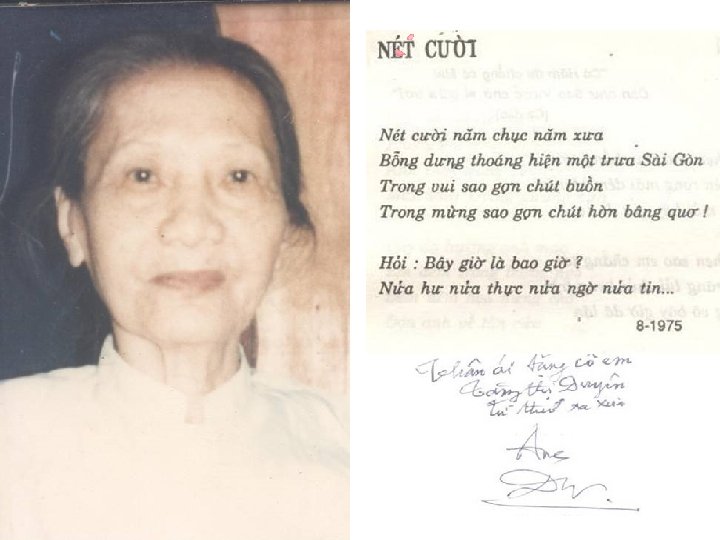 Chuyện năm 1925 và năm 1975 Năm 1925, chàng là sĩ tử xếp bút nghiên lên đường tranh đấu, nàng là tiểu thư khuê các thuộc một giòng họ quan lại ở Hội An. Họ chia tay theo kiểu “thiếp trong song cửa, chàng ngoài chân mây”. Năm 1975 chàng từ Hà Nội về lại Hội An tìm thăm người xưa, “Nàng Thơ” của chàng. Tìm mãi mới biết nàng đã vào Sài Gòn, chàng lại cất công vào TP Sa i Go n …. Gặp lại nhau sau 50 năm xa cách. Kỷ niệm ngày gặp lại, chàng viết bài thơ “Nét cười” để tặng nàng.