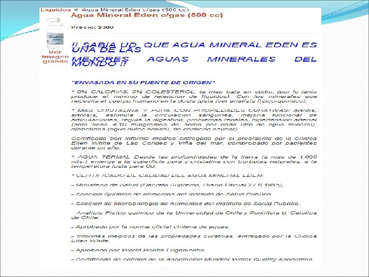 AGUA FORTIFICADA (Continuación) En EEUU venden: Agua con cafeína para serenos; Con hormonas, para mujeres menopáusicas; Con flúor, para niños; Con un compuesto similar al Viagra, para aquellos que necesitan ayuda. En ultimo tiempo se intenta comercializar “nico water”. Mercado del agua mineral fortificada es el segmento de más rápido crecimiento de la industria de las bebidas.