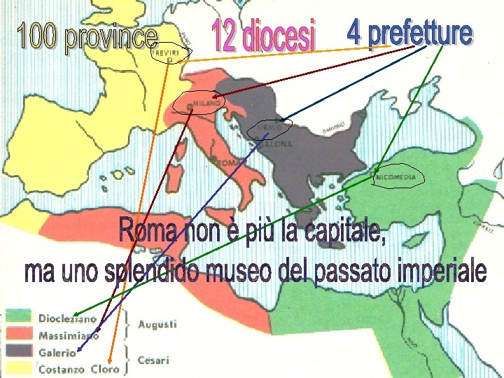 Diminuisce i soldati in ogni legione, ma aumenta le legioni. SCOPO: difficoltà nell’organizzarsi e creare una potenza contro l’imperatore. Tassazione: assicurare entrate sicure nell’impero = immobilismo sociale. LIMITANEI: “truppe di frontiera” -attacchi immediati. CONCOMITATENSES: “soldati accompagnatori” – aiuti situati in più punti. Aumenta le province (100), raccolte in 12 diocesi e suddivise in 4 prefetture. SCOPO: evitare il pericolo di ribellioni.