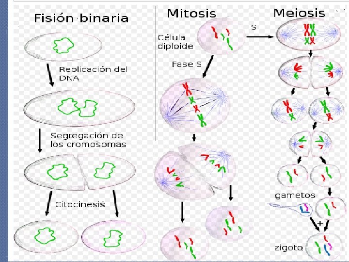 �La meiosis, un proceso que comparte mecanismos con la mitosis pero que no debe confundirse con ella (es otro tipo de división celular, propio de los gametos), produce células genéticamente distintas y, combinada con la fecundación, es el fundamento de la reproducción sexual y la variabilidad genética.