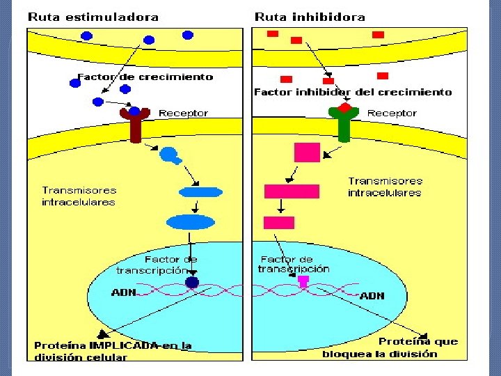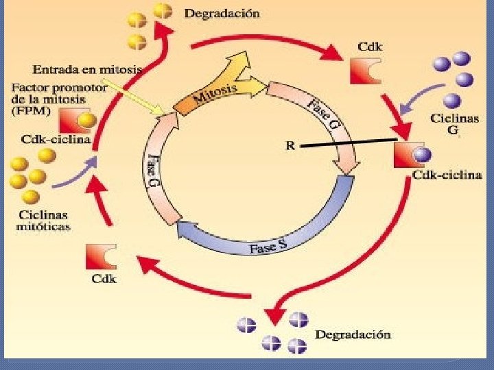 � Cuando las células normales cesan su crecimiento por diversos factores, se detienen en un punto tardío de la fase G 1. � el punto R ("restricción"), primer punto de control del ciclo celular � células pasan de la fase G 1 a un estado especial de reposo, llamado G 0, durante días, semanas o años. � El sistema de control del ciclo celular está basado en dos proteínas las ciclinas y las proteínas quinasas dependientes de ciclinas (Cdk), que responden a esta integración de señales.