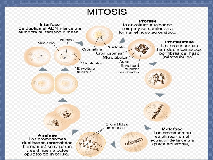 � En los estadios interfásicos del ciclo, los cromosomas son visibles dentro del núcleo sólo como delgadas hebras de material filamentoso llamado cromatina. � mitosis, los cromosomas se distribuyen de manera que cada nueva célula obtiene un cromosoma de cada tipo. � La citocinesis es la división del citoplasma apoptosis es un proceso de muerte celular programada. En los vertebrados, por apoptosis se regula el número de neuronas durante el desarrollo del sistema nervioso.
