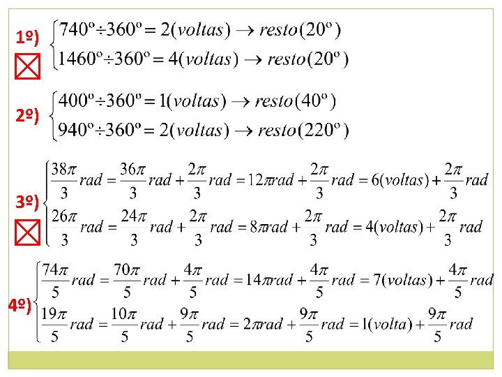 11. Assinale com “X” os pares que representam arcos côngruos. ( ) 740° e 1460° ⊠ ( ) 400° e 940° ( ) ⊠ ( )