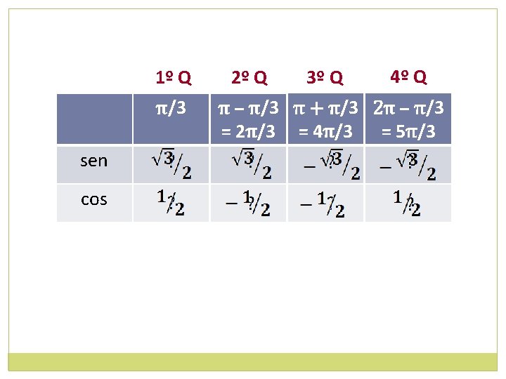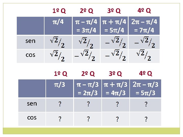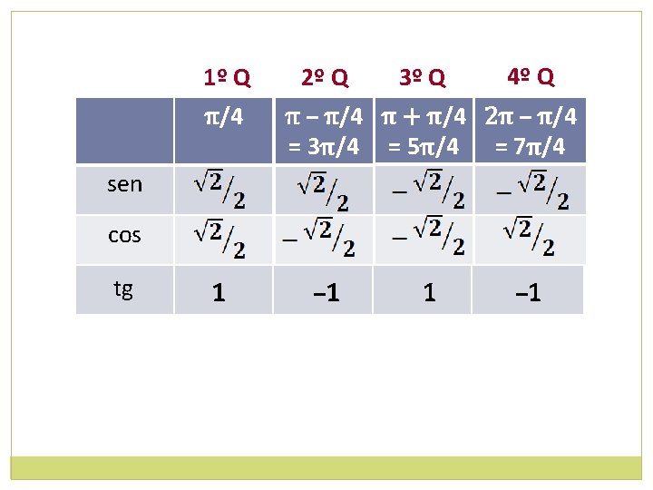 Agora vamos fazer o mesmo para todos os arcos associados a π/4 e π /6 1º Q π/4 sen cos 2º Q 3º Q 4º Q π – π/4 π + π/4 2π – π/4 = 3π/4 = 5π/4 = 7π/4