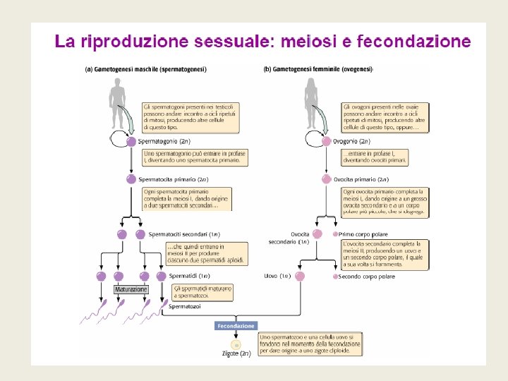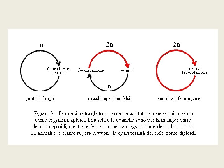 § Tutti i cicli sessuali presentano alternanza stadio aploide e uno diploide § Diversa durata delle fasi nei diversi organismi § Uomo: § Fase aploide nell’uomo: cellule sessuali (gameti) § Fase diploide ristabilita via fecondazione § Con evoluzione aumento fase diploide