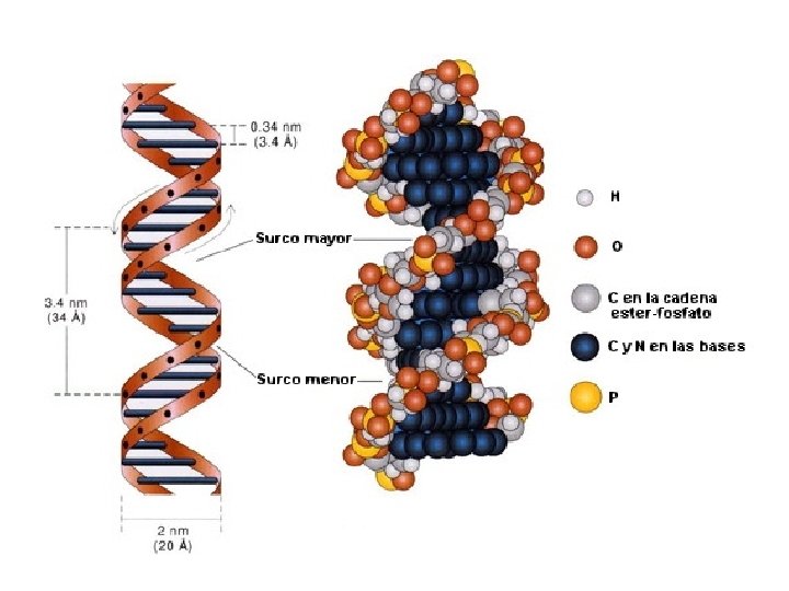 ESTRUCTURA SECUNDARIA • Es una doble cadena de polinucleótidos con enrollamiento dextrógiro y plectonémico (para que se separen es necesario que se desenrollen) • Tiene 2 nm de diámetro formadas por dos cadenas de ADN enrolladas alrededor de un eje imaginario. • Las pentosas y grupos fosfatos forman el esqueleto externo. • Las bases nitrogenadas se disponen hacia el interior perpendiculares al eje de la doble hélice.