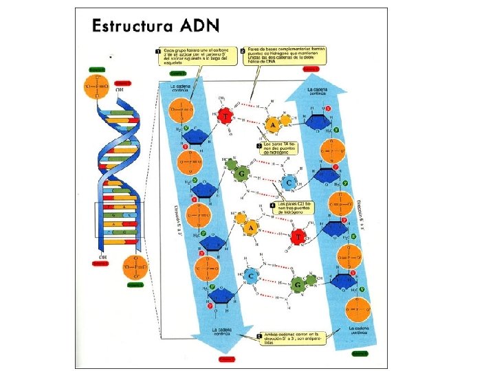 ESTRUCTURA SECUNDARIA • Las dos cadenas se mantienen unidas por puentes de hidrógeno entre las bases: A-T y C-G. • La composición de bases varía pero A=T y C=G • Las dos cadenas son antiparalelas (son paralelas, pero se disponen en sentidos opuestos) y complementarias • Cada pareja de nucleótidos está separada por una distancia de 0, 34 nm. • Giro de la hélice cada 10 nucleótidos (3, 4 nm) • El ADN se localiza en el núcleo.