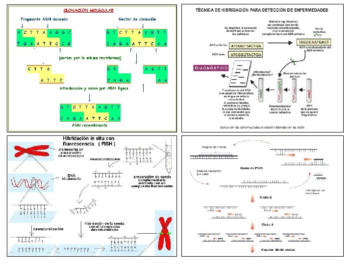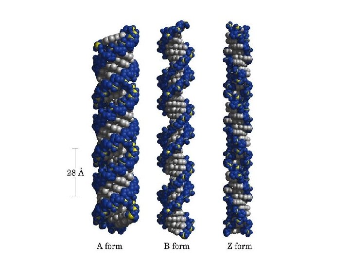 • La configuración espacial descrita por Watson y Crick se denomina forma B y durante mucho tiempo fue considerada la única. • En la actualidad se conocen otras dos formas: Forma A: • Se obtiene por desecación de la forma B y nunca se encuentra en condiciones fisiológicas. Sólo se ha observado en el laboratorio. • Los pares de bases se encuentran en planos inclinados y el eje de la molécula atraviesa dichos planos por puntos desplazados del centro. Es más ancha y más corta que la B. La forma Z • Es más larga y estrecha que la B. • Las dos cadenas de polinucleótidos se encuentran enrollados formando un zig-zag y es levógira. • Se debe a la presencia de numerosos nucleótidos de citosina y guanina alternantes. • Pueden aparecer en determinadas condiciones en los reses vivos.