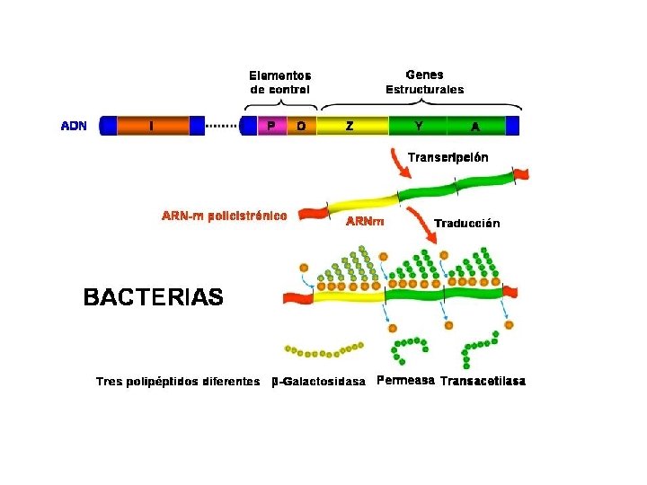 ARNm mensajero • Entre el 2% y el 5% del ARN total de la célula. • Copia la información del ADN en el núcleo y la exporta al citoplasma • Presenta forma lineal, excepto en algunas zonas donde se forman horquillas. • En eucariotas el ARN es monocistrónico: cada molécula codifica para una proteína. • En procariotas el ARNm es policistrónico: cada molécula de ARNm contiene información para sintetizar varias proteínas. • Tiene una vida muy corta (unos minutos), ya que son rápidamente eliminados por acción de ribnucleasas y evitar así que el proceso de transcripción continúe indefinidamente.