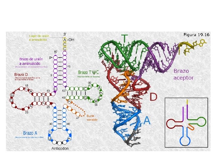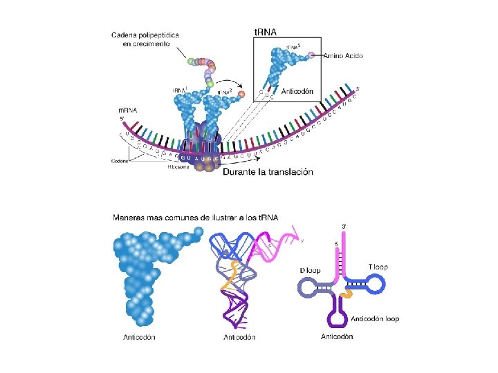 ARNt transferente • Su función es transportar los aminoácidos hasta los ribosomas, donde se unen para formar proteínas. • Tiene una masa de 2, 5· 104 (u) y contiene entre 70 y 90 bases. • Algunas porciones de la molécula presentan una estructura en doble hélice, donde no hay complementariedad entre las bases se forman bucles. • Vista en un plano tiene forma de trébol, en 3 D tiene forma de L. • Contiene nucleótidos con bases nitrogenadas (10%) diferentes a las normales. • Existen hasta 50 tipos distintos de ARNt pero todos tienen características similares