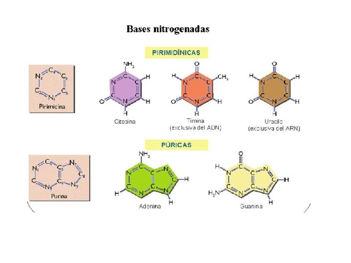 Nucleótido • Ésteres fosfóricos de los nucleótidos • Unión de un nucleósido con un ácido fosfórico (ión fosfato) • Esta unión le confiere un fuerte carácter ácido. • Enlace éster entre el C 5 de la pentosa y el ácido fosfórico • Se nombran con el nombre del nucleósido, añadiendo la terminación 5’-fosfato o monofosfato