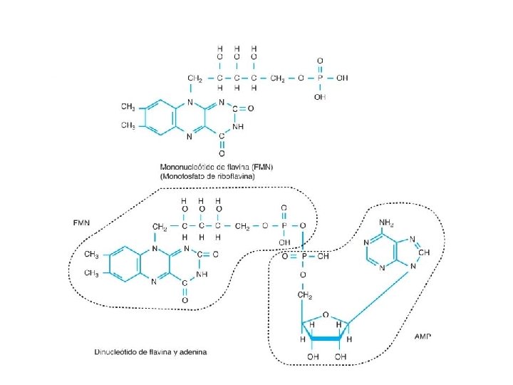 NUCLEÓTIDOS NO NUCLEICOS 3) Nucleótidos de flavina • Formados por flavina y ribitol. • El nucleósido formado se denomina riboflavina o vit B 2 • Son coenzimas de las deshidrogenasas. • FMN: flavin-mononucleótido • FAD: Flavin-adenín-dinucleótido: Molécula de FMN unida covalente a AMP FMN FAD H 2 FMNH 2 FADH 2