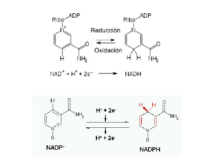NUCLEÓTIDOS NO NUCLEICOS 4) Nucleótidos de piridina • Dinucleótidos formados por al unión mediante enlace fosfodiéster del nicotínamida (vit B 3 o niacina) y el de adenina. • NAD: dinucleótido de nicotinamida y adenina • NADP: fosfato del dinucleótido de nicotinamida y adenina. • Son deshidrogenasas.