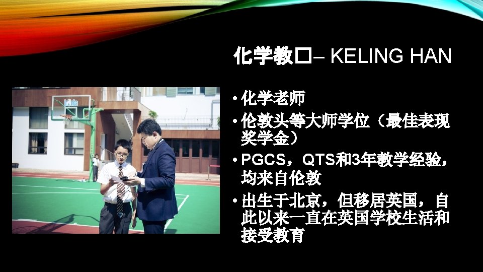 THE CHEMISTRY TEACHERS – KELING HAN • Teacher of chemistry • Masters degree from London First class (Prize awarded for best performing student) • PGCS, QTS and 3 years teaching experience, all from London • Born in Beijing, but moved to the UK and has lived and been educated in British schools since he was 9