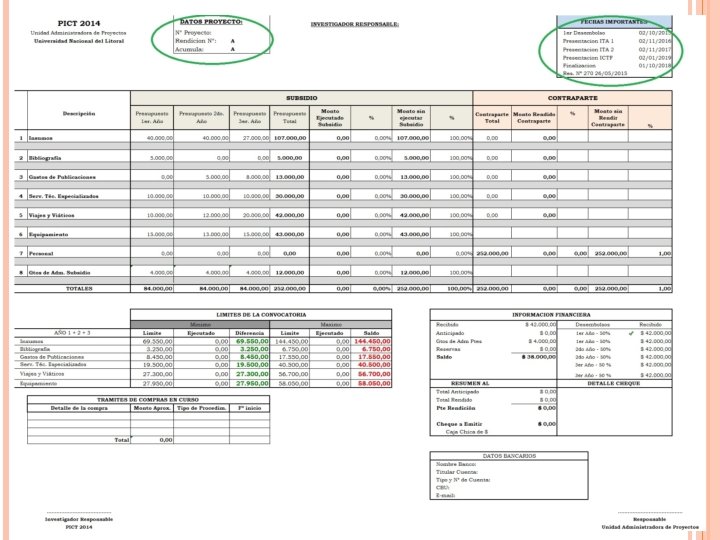 FECHAS IMPORTANTES: Inicio proyecto: 01/12/2017 Reconocimiento de gastos: 05/06/2017 (procedimientos de adquisición) subsidio) Finalización proyecto: • 2 Años: 30/11/2019 • 3 Años: 30/11/2020 Prórrogas Autoriza FONCy. T - “ 3 meses de anticipación” Informe Técnico de Avance. ITA 1 01/01/2019 Informe Técnico de Avance. ITA 2 (si fuera de 3 años) 01/01/2020 (25 meses desde Fº de inicio) Informe Científico Técnico Final (ICTF) 90 días desde Fº de Finalización del Proyecto • 2 Años: 30/01/2020 • 3 Años: 30/01/2021 (1 er desembolso ANPCy. T) (Fº Resolución 285/17 que otorga el (13 meses desde Fº de inicio)
