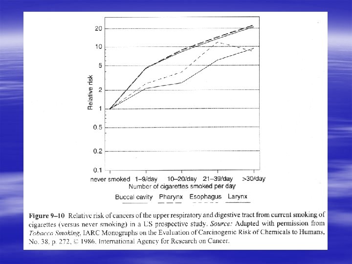 The Strength of the Association § In men, the relative risk ranged from 3. 8 to 14. 2 § In women, the relative risk ranged from 2 to 5 § Men and women who smoked one of more packs per day experienced a 25 to 30 -fold increased risk of dying from lung cancer when compared with non-smokers