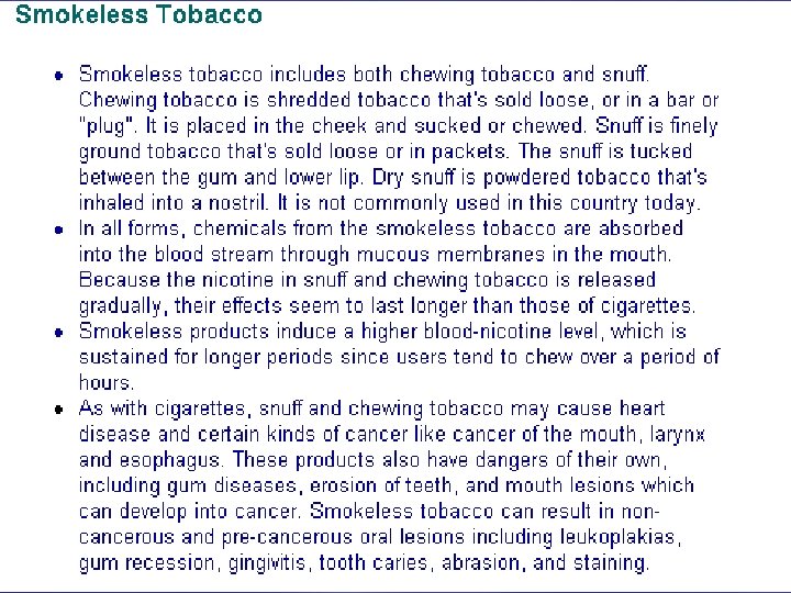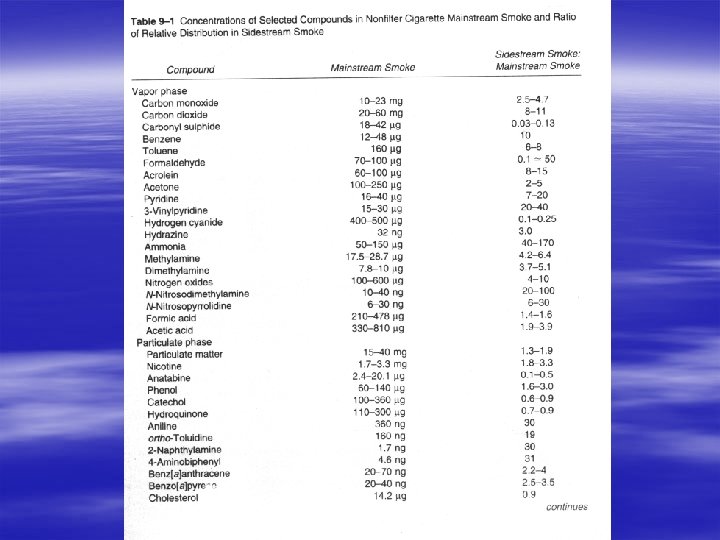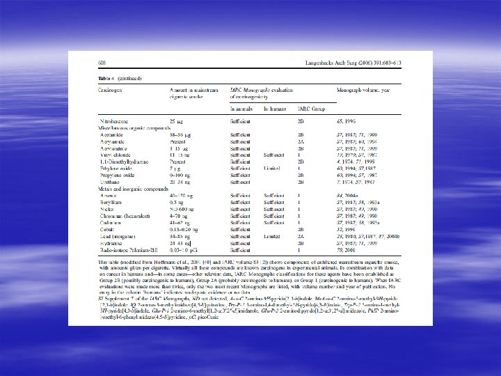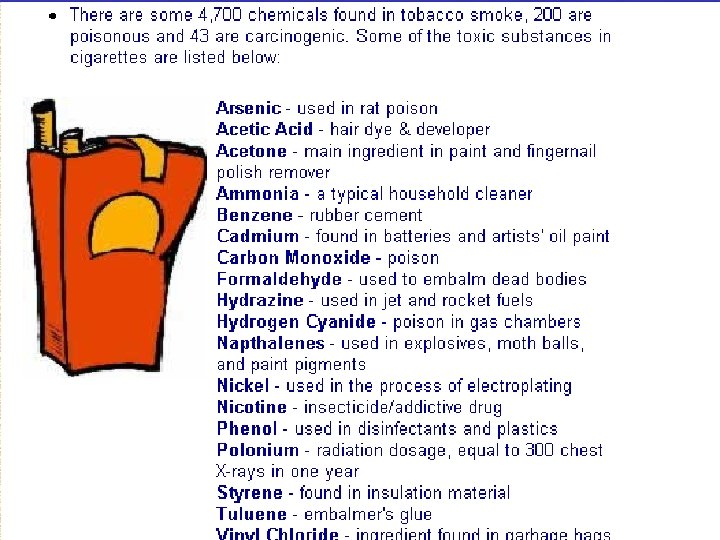 Tobacco Smoking § Tobacco smoke contains over 4, 000 chemical compounds § includes at least 60 different carcinogenic substances.