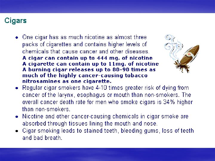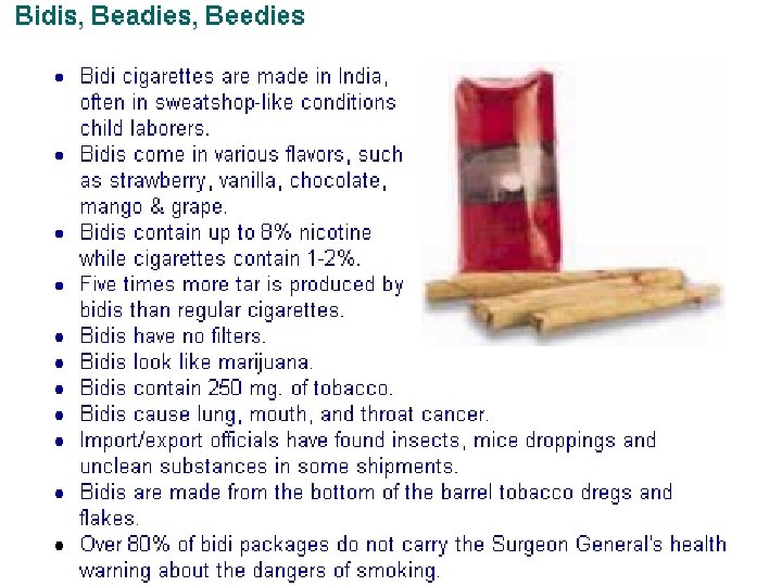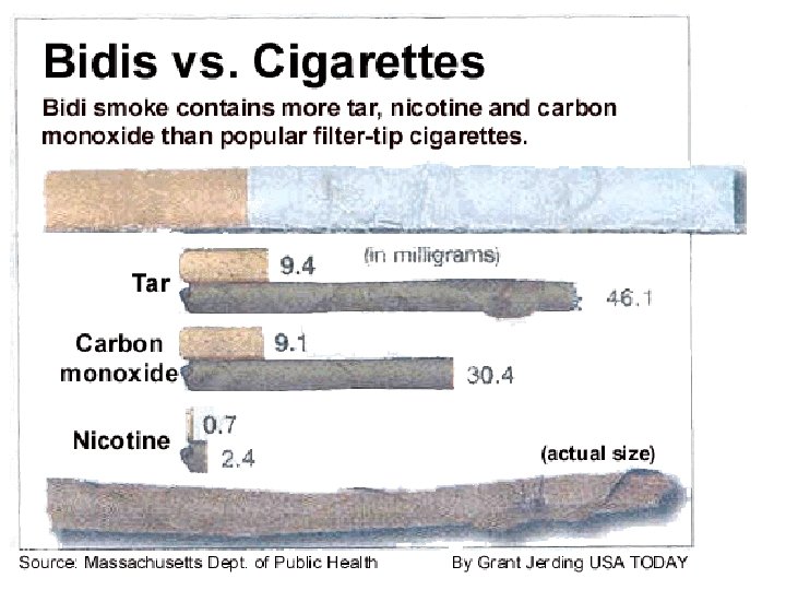 Lung Cancer: Other Tobacco § The early observation that pipe-smokers and smokers of cigars had a lower risk of lung cancer than cigarette smokers is due to the lesser amount of tobacco smoked and to the lower degree of inhalation. § Smokers of other types of tobacco (e. g. bidis in India) are at similar risk to smokers of cigarette.