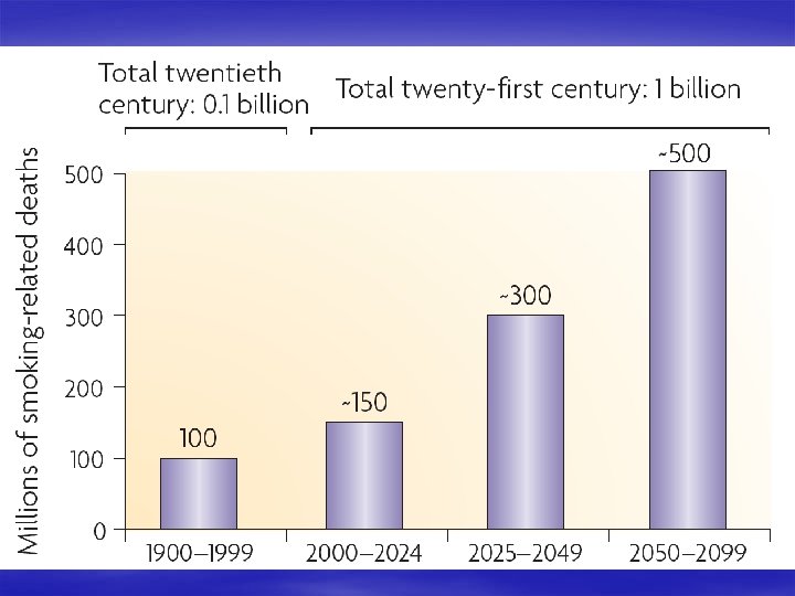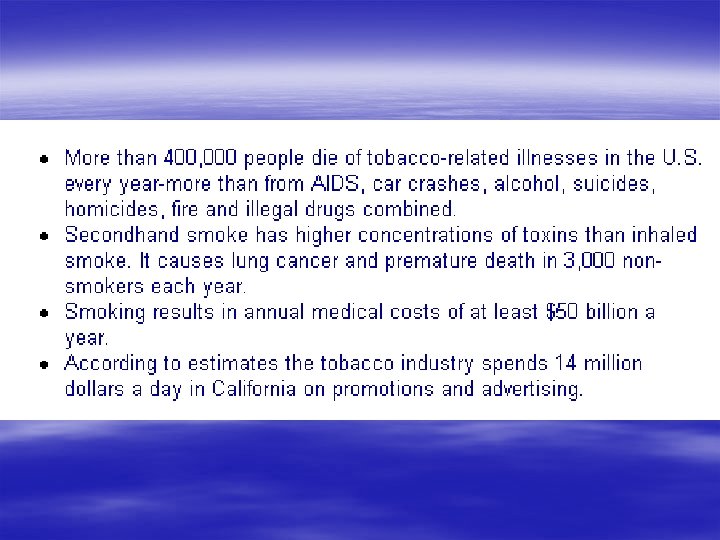 Smoking and Health § An estimated 47 million adults in the U. S. smoke cigarettes, which will result in death or disability for half of all regular users § Over 46 million Americans have quit smoking but 3, 000 adolescents try their first cigarette every day.