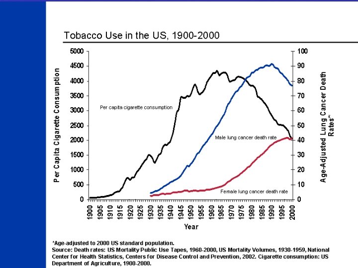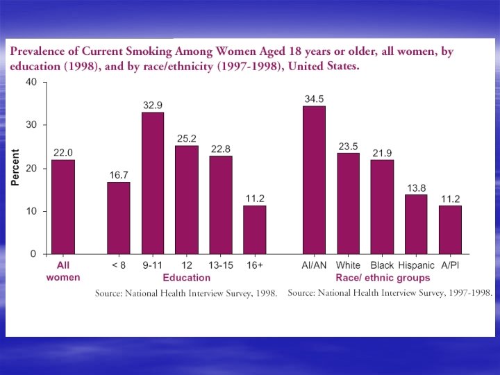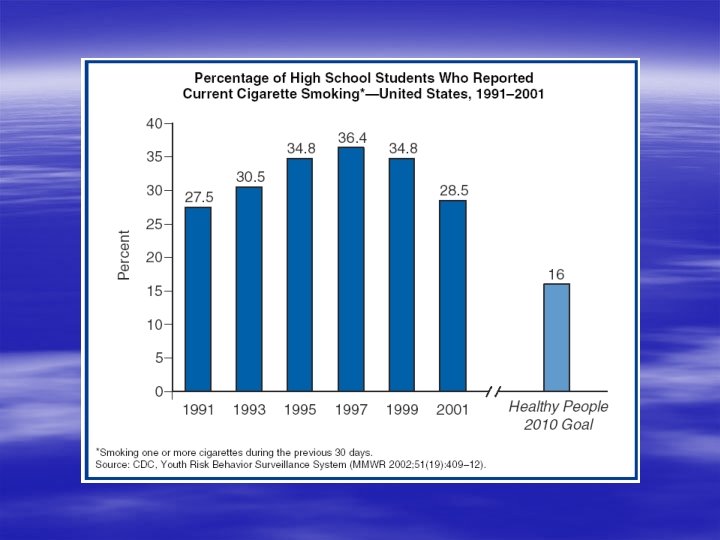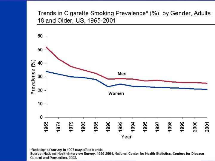 Trends in cigarette smoking* among adults aged >18 years, by sex - United States, 1955 -2002 Men Women 24. 5% 18. 8% *Before 1992, current smokers were defined as persons who reported having smoked >100 cigarettes and who currently smoked. Since 1992, current smokers were defined as persons who reported having smoked >100 cigarettes during their lifetime and who reported now smoking every day or some days. Source: 1955 Current Population Survey; 1965 -2002 National Health Interview Survey; 2002 estimates for first quarter only