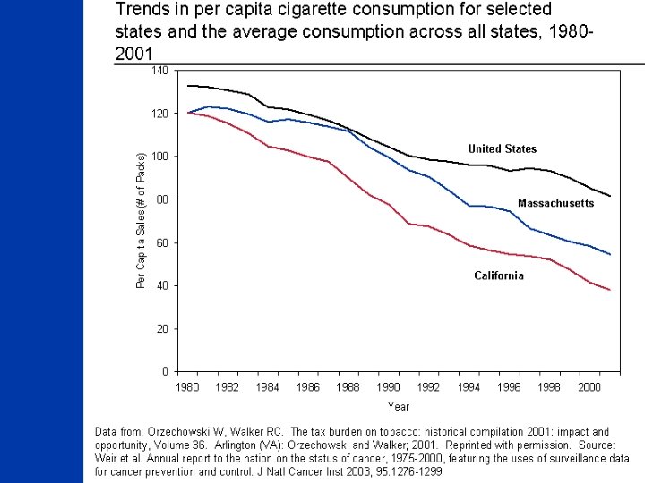 Decreased Cigarette Consumption in the US since 1965 § Since 1950, scientific reports linking cigarette smoking with cancers and other chronic diseases § Bans on TV and radio advertising § The growth of the nonsmokers rights movement § A dramatic increase in federal and state cigarette tax