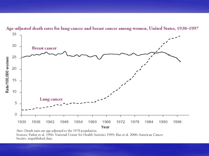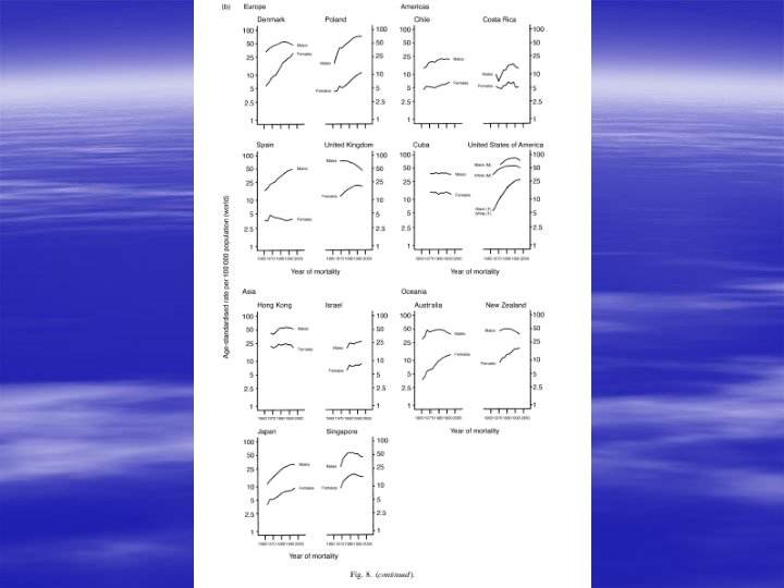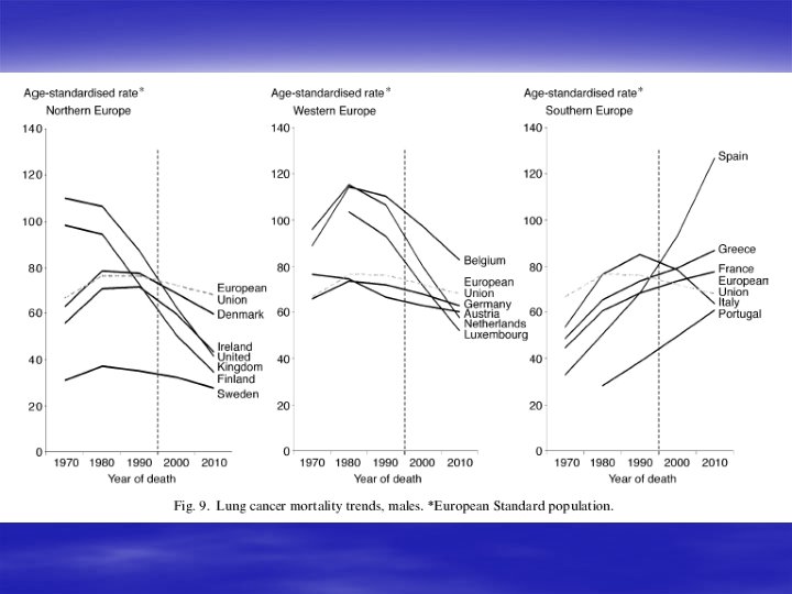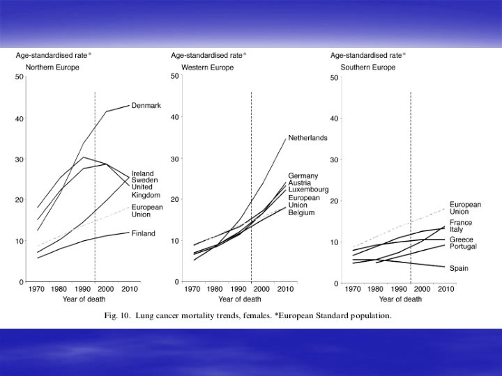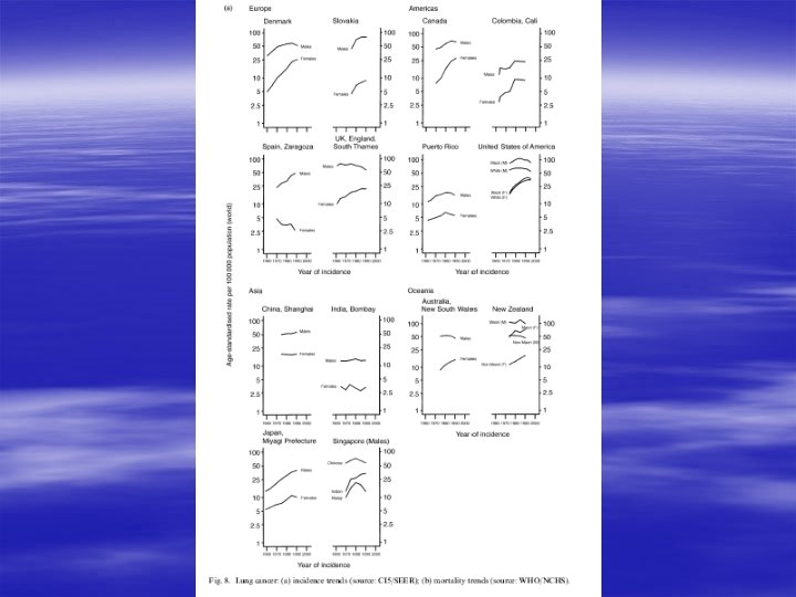 Lung Cancer: Time Trends § Decreased smoking prevalence leads to a decreased risk of lung cancer in several countries such as U. K. , Finland, Australia, the Netherlands, New Zealand, the USA, Singapore, and more recently Denmark, Germany, Italy, and Sweden. § In most other countries, there is a continuing rise in rates, and this is most dramatic in the countries of Eastern Europe. § In women, with increase smoking prevalence, the risk of lung cancer increase.