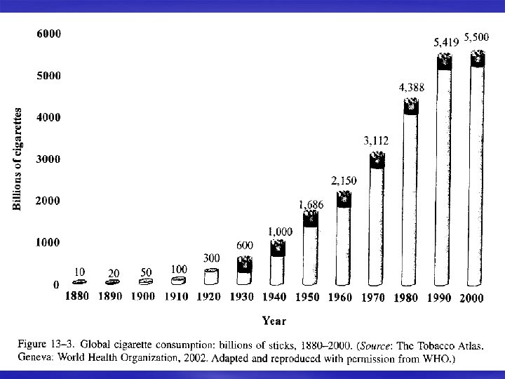 Adult Per Capita Cigarette Consumption and Major Smoking and Health Events – United States, 1900 -2001 1 st World Conference on Smoking and Health 1 st Surgeon General’s Report Broadcast Ad Ban 1 st Great American Smoke-out End of WW II OTC Nicotine Medications Master Settlement Agreement Fairness Doctrine Messages on TV and Radio 1 st Smoking-Cancer Concern Non-Smokers Rights Movement Begins Surgeon General’s Report on ETS Federal Cigarette Tax Doubles Great Depression Source: United States Department of Agriculture