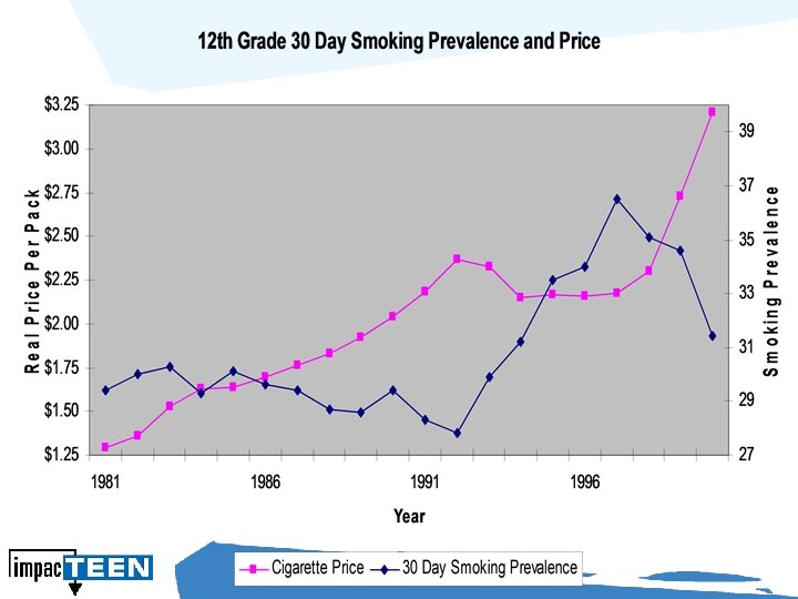 Cumulative Age of Initiation of Cigarette Smoking* Among Persons Aged 30 – 39 Years—United States, 1996 -1998 Age First Tried a Cigarette Age Began Smoking Daily * Among persons 30 -39 years old who have ever smoked daily Source: National Household Survey on Drug Abuse, 1996 -1998 public use data tapes