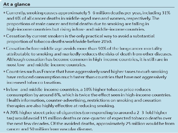 Prospects for Prevention § Smoking cessation among smokers § Reinforcing social pressure to make smoking unattractive and difficult for adolescents to start smoking § Early detection of early lesions, by x-ray or other means
