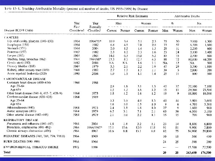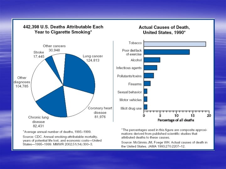 Smoking and Health § Direct medical care cost from smoking related diseases were estimated to be $50 billion in 1993 § Another $50 billion in indirect costs, such as time lost from work, housekeeping expenses, and lost income, etc.