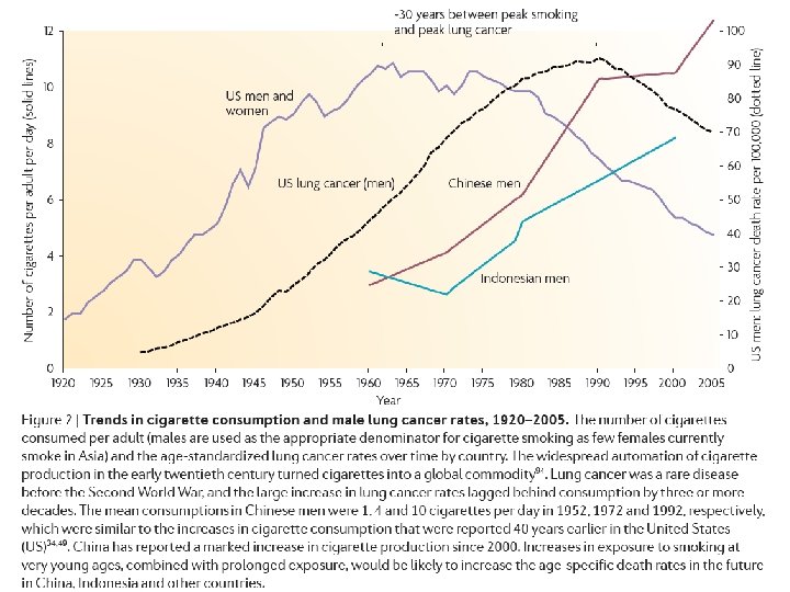 Lung Cancer: Cigarette Smoking § Overall, 86% of cases in men and 49% in women are due to smoking. § For regions with longest history of smoking, 90% cases in men. The proportions are more variable in women from 0% to 80% (UK)