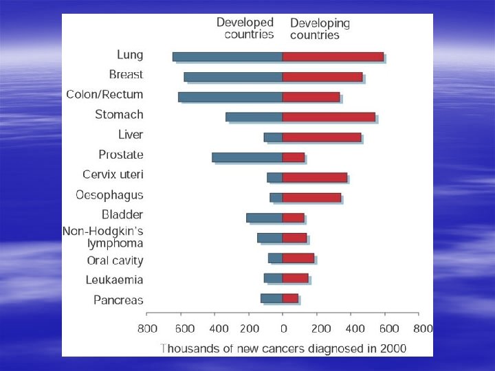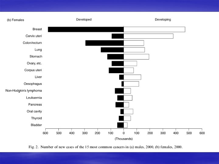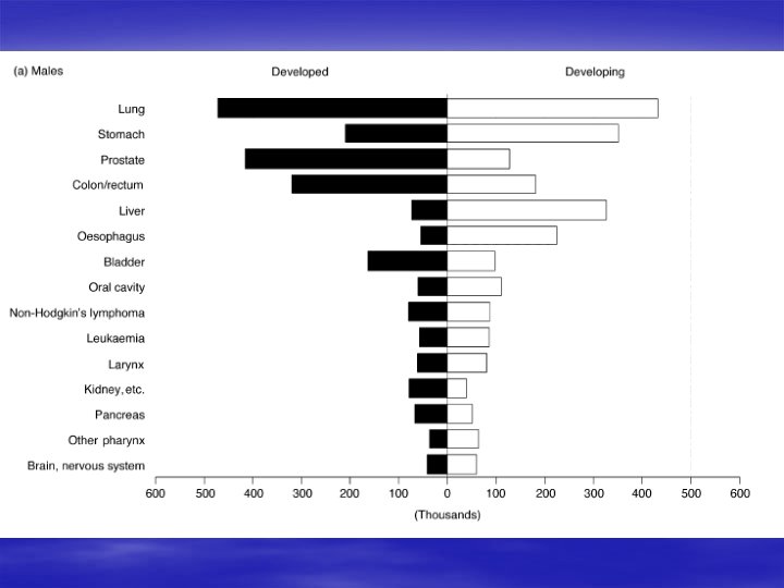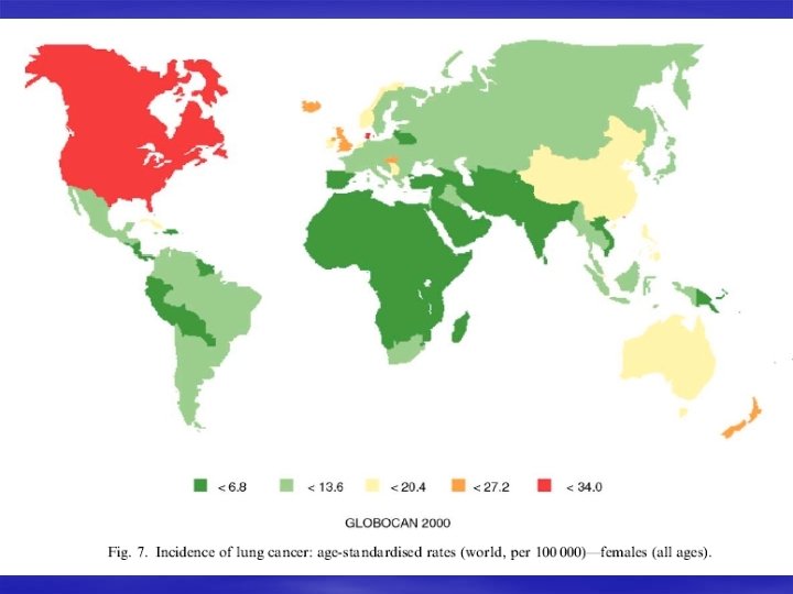 Lung Cancer: Distributions § The commonest cancer in the world (1. 2 million new cases in 2000, 12. 3% of all new cases) § 52% in the developed countries and 48% in the developing countries § More common in men (75%) than in women § Areas with highest incidence include Europe (Eastern Europe), North America, Australia /New Zealand, and Southern America. § The rates in China, Japan, and Southeast Asia are moderately high.