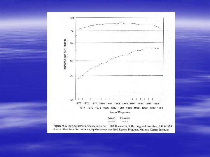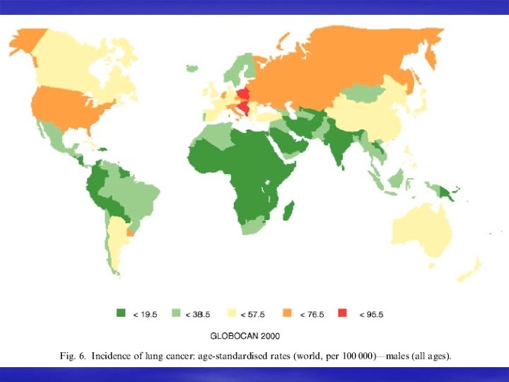 Lung Cancer: Distributions § For US blacks, New Zealand Maoris men, about 13% chance of developing a lung cancer before the age of 75 years. § In developing countries, the highest rate are seen where the tobacco smoking habit has been longest established – the Middle East, China, the Caribbean, South Africa, Zimbabwe, and the Pacific.