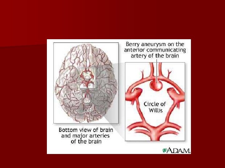 Berry Aneurysm n Aka saccular aneurysm n Attached by a neck or a stem to an artery n Accounts for 90% of all aneursyms