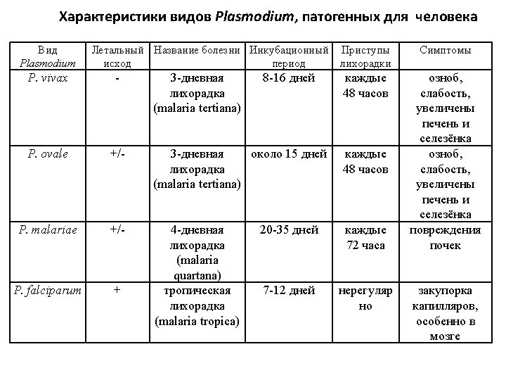 Ordo Haemosporiida Species Plasmodium – Отряд Кровяные споровики vivax ovale malariae falciparum