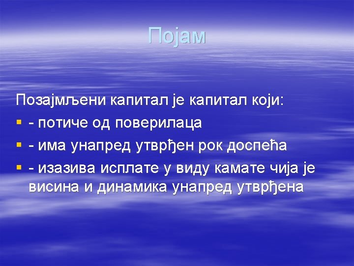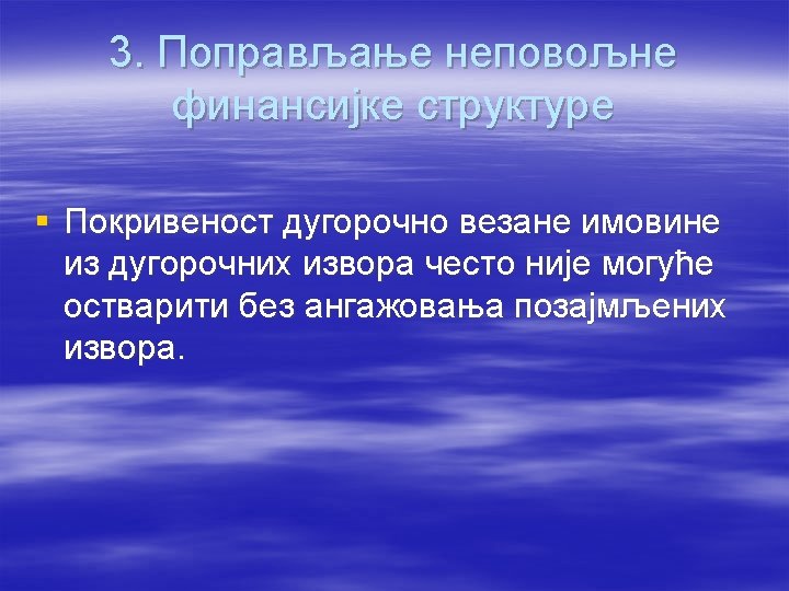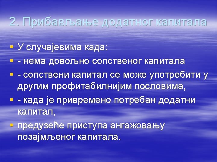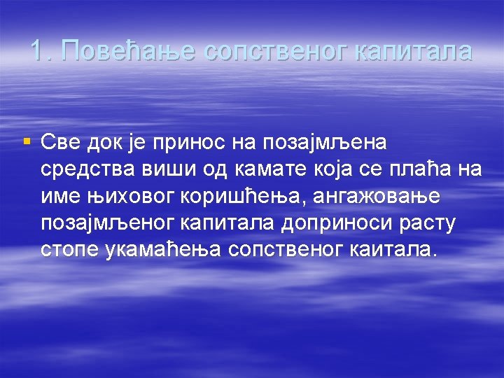 § Ukoliko je kamata na pozajmljena sredstva manja od prinosa na ukupan kapital, preduzeće u cilju povećanja stope prinosa na sopstveni kapital treba da: § povećava učešće pozajmljenog kapitala u ukupnom kapitalu; § smanjuje učešće pozajmljenog kapitala u ukupnom angažovanom kapitalu; § povećava i pozajmljeni i sopstveni kapital § dva puta više povećava sopstveni u odnosu na pozajmljeni kapital.