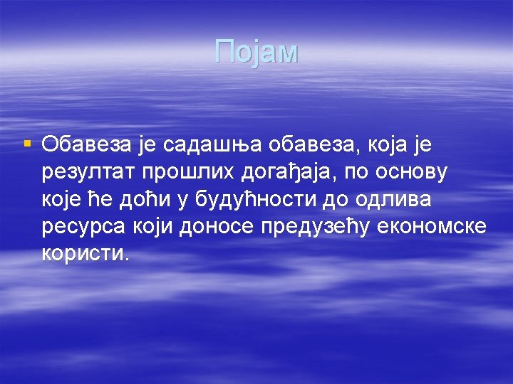 Sadašnja obaveza § Sadašnja obaveza je obaveza izazvana prošlim dogadjajem § Rezervisanje se formira ako je na dan bilansa verovatnije nego što nije da sadašnja obaveza postoji
