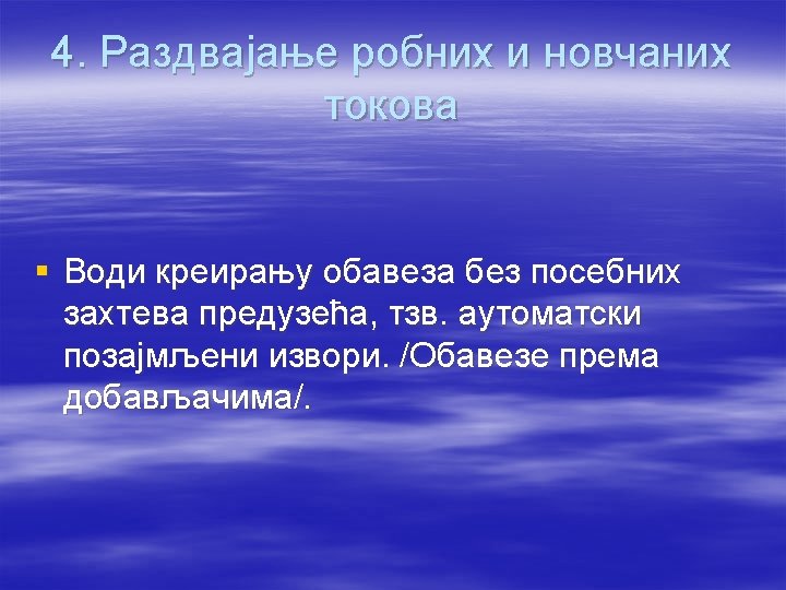 4. Rezervisanja i potencijalne obaveze § § § Rezervisanja obuhvataju sadašnje obaveze odliv ekonomskih resursa koji stvaraju ekonomske koristi radi njihovog izmirenja je verovatan § § Potencijalne obaveze § obuhvataju moguće obaveze čije postojanje će biti potvrdjeno jedino nastajanjem ili nenastajanjem nekog neizvesnog budućeg dogadjaja § odliv ekonomskih koristi nije verovatan § Ili sadašnja obaveza koja nije priznata bilo zbog toga što nije verovatan odliv ekonomskih koristi bilo zbog nemogućnosti pozdanog utvrdjivanja visine.